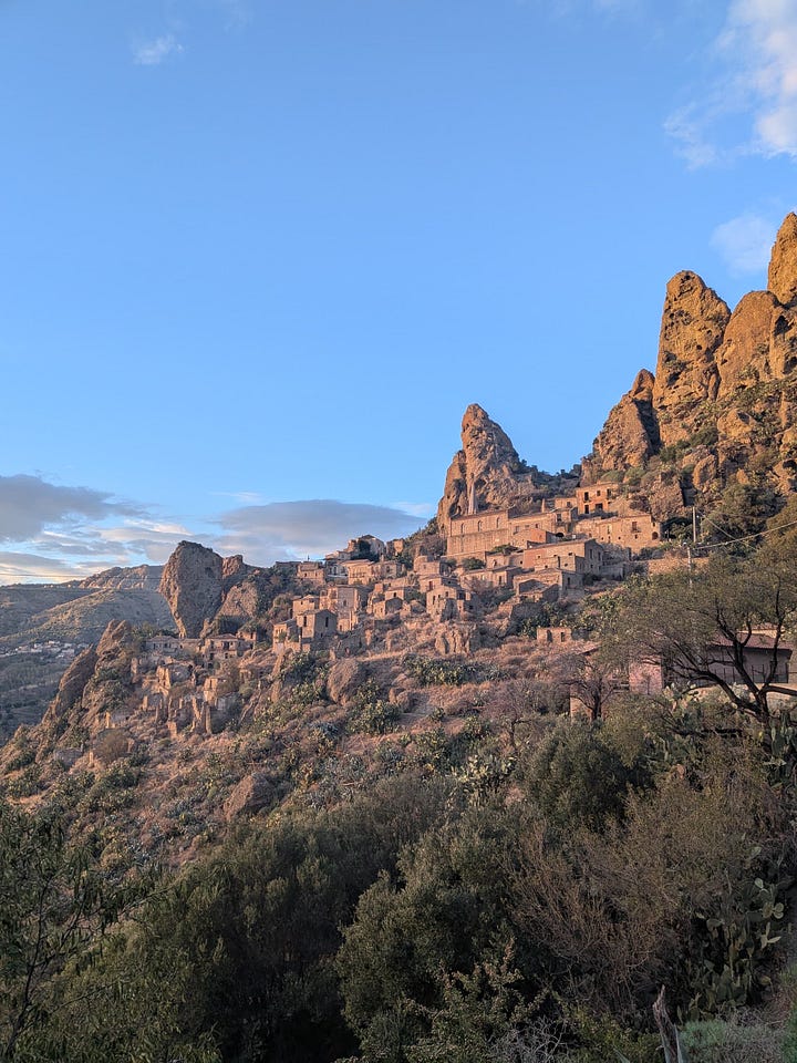 Am nächsten Tag fahrt ihr weiter. In der alten, verlassenen Siedlung Pentedatillo, wo die Häuser in die Felsen gebaut wurden und heute nur noch drei Menschen leben, findest du einen Touristenkiosk. Der ältere Verkäufer steht draußen und raucht gedankenverloren eine Zigarette nach der anderen. Er trägt einen Pferdeschwanz und hat eine Hautkrankheit. Du schaust dir seine Bücherauswahl an und entdeckst Journals of a Landscape Painter in Calabria von Edward Lear. Es kostet nur 15 Euro. Du willst es kaufen, legst es aber wieder zurück – du könntest es später auch online bestellen. Als du unterwegs nach dem Buch suchst, findest du nur ein einziges Exemplar, das aus den USA verschickt werden müsste und über 80 Dollar kostet. Du beeilst dich zurück ins Geschäft, doch bist zu spät: Der Mann fährt gerade auf seinem Scooter davon. Mittagspause. Mist. Vier Stunden später kehrst du zurück in der Hoffnung, dass er wieder da ist und hast Glück. Er steht draußen und raucht, du gehst hinein, nimmst das Buch und wartest an der Kasse. Er schaut dich lächelnd an und sagt etwas, das das Wort stamattina enthält. Du verstehst, dass er fragt, ob du schon mittags da warst. Glücklich, dass er sich an dich erinnert, antwortest du Si, si, quiero comprar el libro. Du weißt nicht, ob er dich versteht, da du nur Spanisch sprichst.