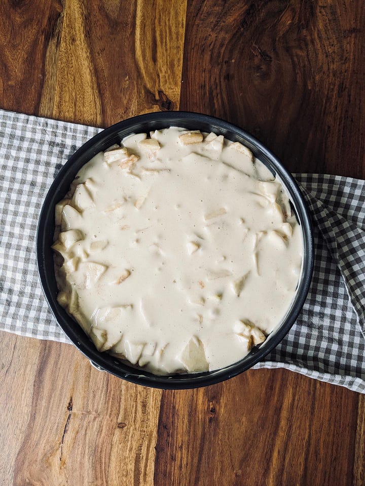 Der cremige Teig löst sich langsam von der Spachtel und fällt sanft in die Schüssel, die bis zum Rand mit zimtig-zuckerigen Apfelstückchen gefüllt ist.