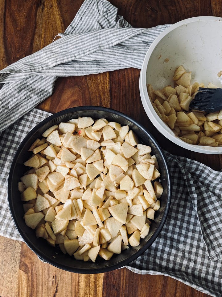 Mit frischer Überzeugung, dass man sich in diesem Leben sowieso auf niemanden verlassen kann, nahm ich mein Schicksal selbst in die Hand und ging zum REWE, um dort einen Sack Äpfel zu kaufen. Zeit für Apfelkuchen! Einen richtig großen noch dazu. So habe ich für die ganze Woche genug, um meine süßen Gelüste zu stillen. Ich klopfte mir mental auf die Schulter und dachte an folgende Sätze, die sich wie Mantras in meinem Kopf abspielten: Ich kümmere mich selbst um mein Wohlbefinden, interpretiere jedes Hindernis als Möglichkeit, bin nicht von anderen Menschen abhängig, kreiere meine eigenen Genussmomente und sorge für Fülle im Herzen und auf den Hüften! Diese Art von Unabhängigkeit strebt doch jeder Millennial an. Wen interessiert es, ob ich ein Oktoberdessert an einem heißen Julitag backe? Berlin kann sich auch nicht entscheiden, ob es nun Sommer oder doch schon Herbst ist, also warum sollte ich? Die Stadt und ich sind launisch, und ich brauche Ablenkung. Dabei ist Apfelkuchen (oder Scharlotka, wie ichs von zu Hause kenne), dessen Duft mich an meine Kindheit erinnert, der verlässlichste Trostspender.